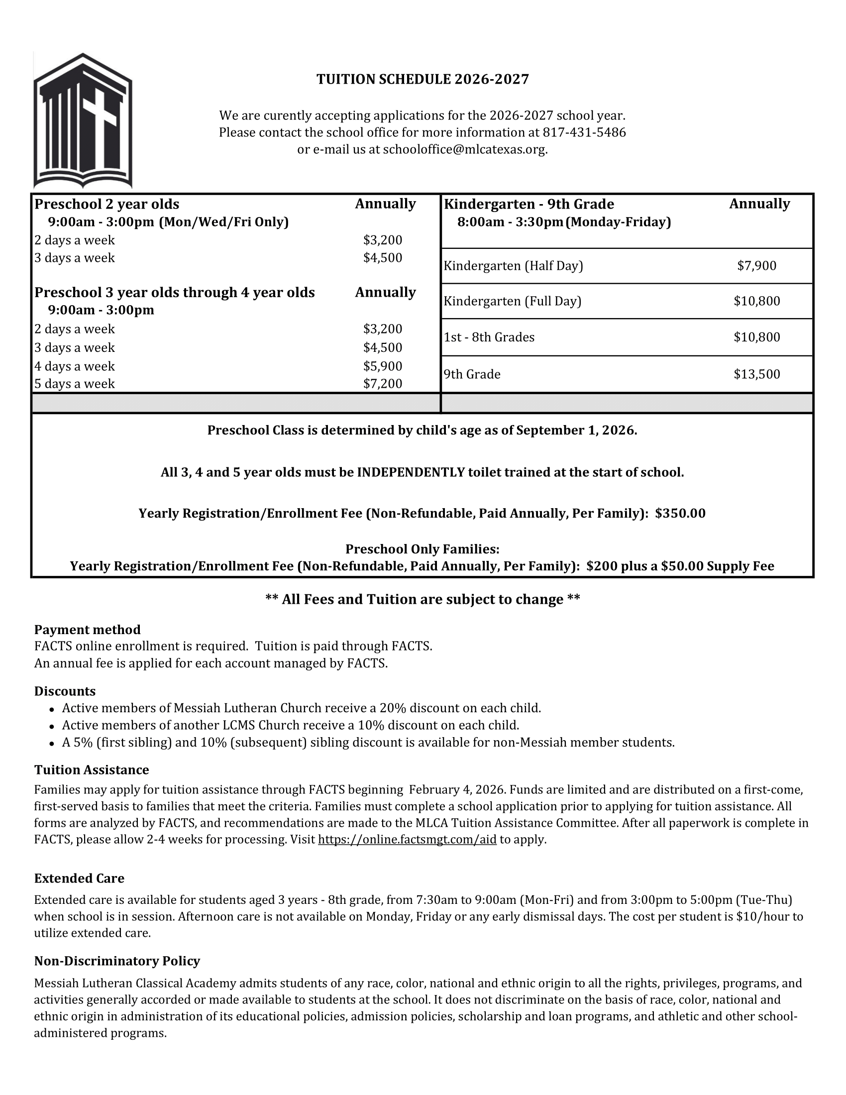 Messiah Lutheran Classical Academy admits students of any race, color, national and ethnic origin to all the rights, privileges, programs, and activities generally accorded or made available to students at the school. It does not discriminate on the basis of race, color, national and ethnic origin in administration of its educational policies, admission policies, scholarship and loan programs, and athletic and other school-administered programs.